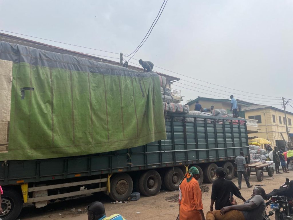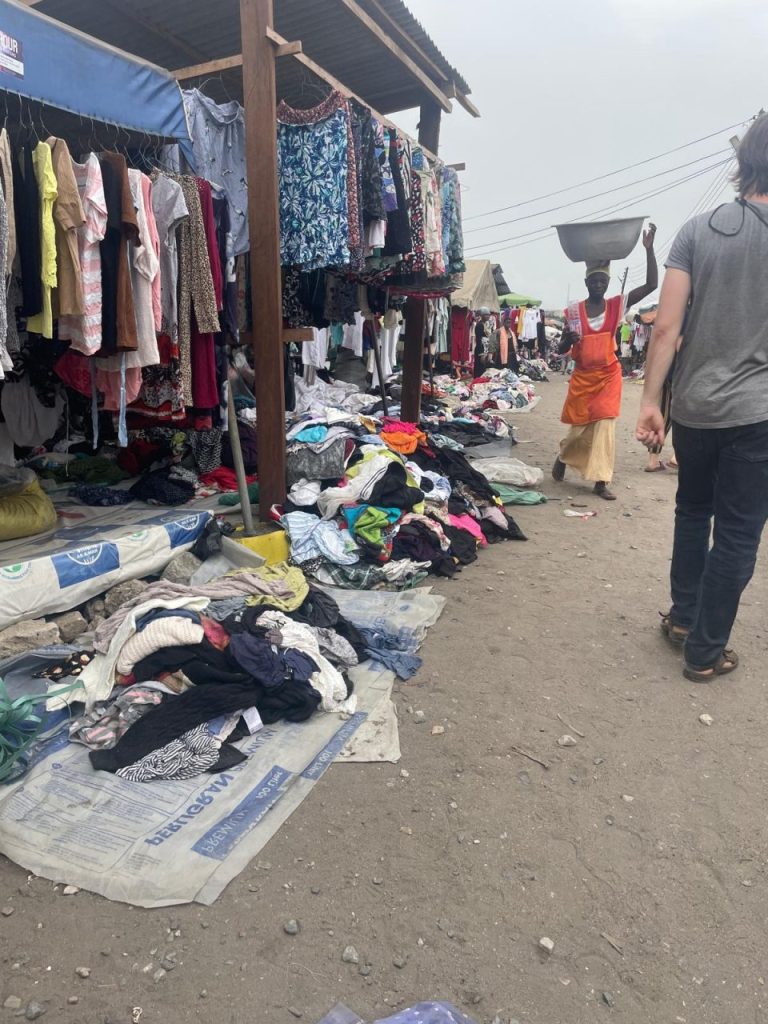 Bevor wir jedoch den Elektroschrott sahen, führten uns Grace, eine Sozialarbeiterin, die selbst in Old Fadama aufgewachsen ist, und ihre Schwester Blessing über den Textilmarkt. Es ist der größte Markt für Secondhand-Kleidung in ganz Westafrika. Hier kommen die Container mit den „Kleidern des toten weißen Mannes“, wie die Übersetzung des Namens dieses Marktes heißt, an. Wobei es sich natürlich nicht wirklich um die Kleider von Toten handelt, sondern vielmehr um Sachen, die zurückgeschickt oder bis Ende der Saison nicht verkauft wurden oder auch um den Inhalt von Altkleidercontainern. Die Kleidung kommt in riesigen in Plastik (wieder Müll!) eingewickelten Paketen an. Diese werden dann von Händlern auf gut Glück gekauft (man sieht ja nicht, was drin ist) und nach Brauchbarkeit sortiert. Etwa vierzig Prozent der Kleidung wird weiterverkauft, der Rest landet auf der Müllkippe, wie Grace mir erklärte.