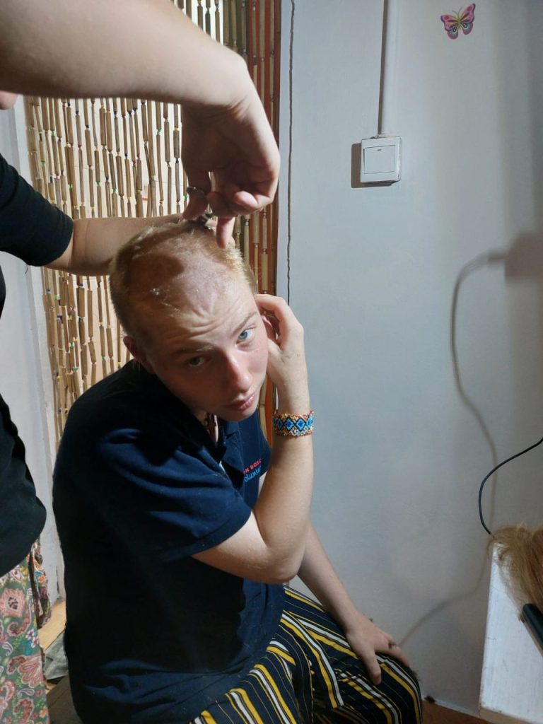 Ich hatte schon länger mit dem Gedanken gespielt und an diesem Abend sollte es also geschehen! Maria und Lotte flochten mir kleine Zöpfchen (ich glaube, die beiden waren noch aufgeregter als ich selbst) und alle durften einen Zopf abschneiden. Dann kam Quirin mit seiner Haarschneidemaschine und rasierte mir einen Avatar-The-Last-Airbender-Strich. Er wollte gerade anfangen, mir die restlichen Haare auch abzurasieren, da gab das blöde Teil plötzlich den Geist auf. Da saß ich nun also mit unregelmäßig kurzen Haaren und einem umgekehrten Iro. Auf gar keinen Fall würde ich so vor die Tür gehen! Also versuchten Leonie, Maria, Marlene und Lotte mit Matildes Haarschneideschere und mit Nagelscheren (!) zu retten, was zu retten war. Sie taten ihr bestes und das Ergebnis war auch den Umständen entsprechend gut, doch zu unserem anschließenden Salsa-Abend zog ich trotzdem lieber ein Käppi über.
