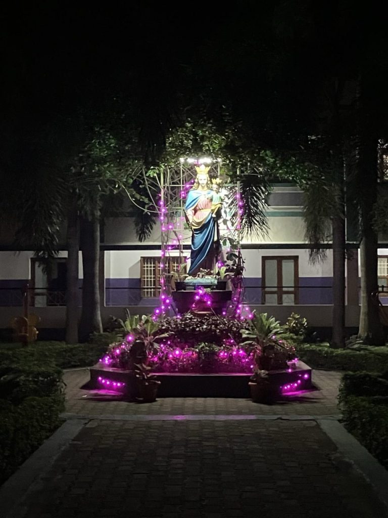 Des guirlandes lumineuses sont désormais disposées autour de la statue de Marie dans la cour intérieure, de sorte que Marie clignote la nuit dans différentes couleurs néon, ce qui est assez distrayant pendant la prière du soir.