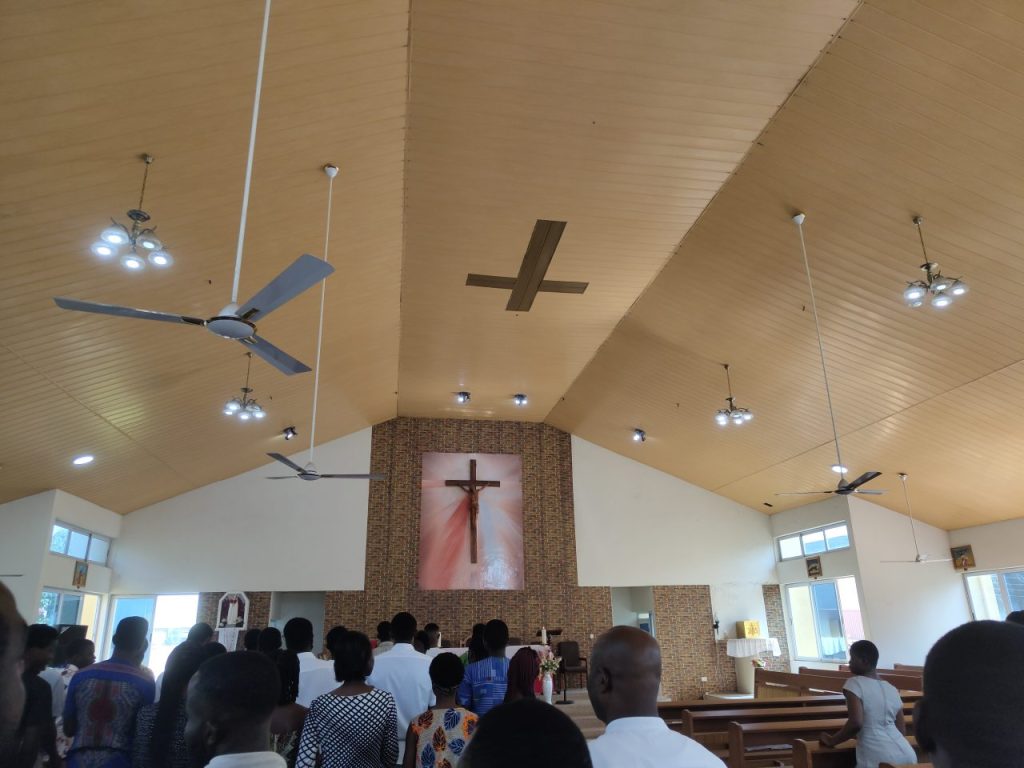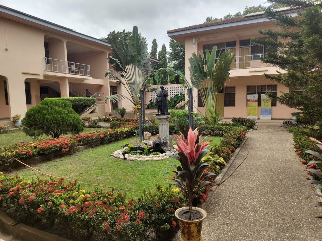 In Accra gelandet – sofort schlägt einem die unglaubliche Luftfeuchtigkeit und Wärme des Landes ins Gesicht, als man aus dem Flugzeug steigt. Aus dem Flugzeug ging es in einen Bus, der uns zum Flughafengebäude brachte. Während dieser Busfahrt ging einem alles durch den Kopf: Hoffnungen, Vorfreude, aber natürlich auch Sorgen und Nervosität.Nach der Busfahrt haben wir unser Gepäck abgeholt. Während meines nach wenigen Minuten vollzählig versammelt war, musste Quirin um sein Gepäck zittern. Doch auch das kam nach guten 15 Minuten an. Im Nachhinein hatten wir ziemlich Glück, da uns Einheimische gesagt haben, dass es wahrscheinlicher sei, dass das Gepäck nicht ankommt, als dass es ankommt.Am Flughafen mussten wir uns nach der Gepäckkontrolle durch eine Menschenmenge an Taxifahrern kämpfen, die uns unbedingt als Kunden gewinnen wollten. Unser Englisch muss am Anfang noch zu schlecht gewesen sein, denn selbst nachdem wir ihnen erklärt hatten, dass wir abgeholt werden, standen sie immer noch neben uns, als erwarteten sie, dass wir gleich in ihr Taxi einsteigen. Erst als Robert und Madame Carole zu uns kamen, ließ auch der letzte Taxifahrer von uns ab.Robert war für uns in Accra zuständig und hat sich um so ziemlich alles für uns gekümmert. Madame Carole war zwei Wochen in Sunyani und hat dort im Boys’ Home gearbeitet – so wie wir jetzt. Durch sie haben wir die ersten richtigen Eindrücke von unserer zukünftigen Arbeit bekommen. Ein paar Sightseeing-Tipps haben wir auch mitgenommen, von denen wir euch dann hoffentlich in zukünftigen Blogs erzählen können. Vom Flughafen ging es dann zur Community in Accra, wo wir die nächsten sechs Tage verbringen sollten.Angekommen am Don Bosco Campus hieß es dann erst einmal: Zimmer beziehen, eine Kleinigkeit essen und dann ab ins Bett!Am nächsten Morgen lernten wir einige der Salesianer hier in Ashaiman kennen und schauten uns ein wenig auf dem Gelände um. In den folgenden Tagen stand die Non-Citizen-Card an – also ab zum Geldabheben und direkt ins zuständige Büro. Dort angekommen, mussten wir dann einmal unsere halbe Lebensgeschichte erzählen, und nach knapp zwei Stunden waren wir durch und hatten unsere Karte!Also ab zum nächsten MTN-Shop und eine SIM-Karte kaufen – dachten wir zumindest! Im Shop erfuhren wir dann, nachdem wir wieder 45 Minuten gewartet hatten, dass das System abgestürzt sei und vermutlich erst in frühestens einem Monat wieder funktionieren würde. Na gut, dann eben ohne Internet! Beim Warten auf unsere nicht vorhandene SIM-Karte hat uns Robert unser erstes ghanaisches Streetfood gezeigt: frittierte Bällchen aus Maniok (Cassava) und Zwiebeln, zu denen man immer ein kleines Stückchen Kokosnuss isst!Die darauffolgenden Tage verbrachten wir sehr entspannt mit Fußballspielen mit den Jungs aus der Umgebung, die nachmittags immer auf dem Campus unterwegs waren. Von Father Eric und Robert bekamen wir dann noch Orientierungsunterricht, damit wir bestens auf die Aufgaben in Sunyani vorbereitet sind.Am Sonntag, einen Tag vor unserer Abreise nach Sunyani, waren wir das erste Mal bei einem ghanaischen Gottesdienst dabei. Trotz der Parallelen zum heimischen Gottesdienst gab es vor allem in der Musik große Unterschiede, da hier afrikanische Gospel zur musikalischen Begleitung gesungen werden. Insgesamt fanden wir den Gottesdienst viel lebendiger als in Deutschland.Am 15.09. hieß es dann: Sachen packen und zum Busbahnhof! Also kämpften wir uns mit Robert durch den Abendverkehr Richtung Accra. Eigentlich waren es ja nur 32 km… Zwei Stunden später standen wir dann vor dem Ticketschalter und machten uns auf zu unserem Bus. Nach kurzem Verhandeln, wie viel wir denn für unser Gepäck zahlen sollten, ging es dann auch los. Die ersten Stunden predigte noch ein Mann lautstark im Bus, ehe es langsam ruhig wurde und man zumindest mal versuchen konnte, etwas zu schlafen. Ansonsten hören wir uns wieder wenn es heißt „Quirin und Elia machen Ghana Unsicher!“