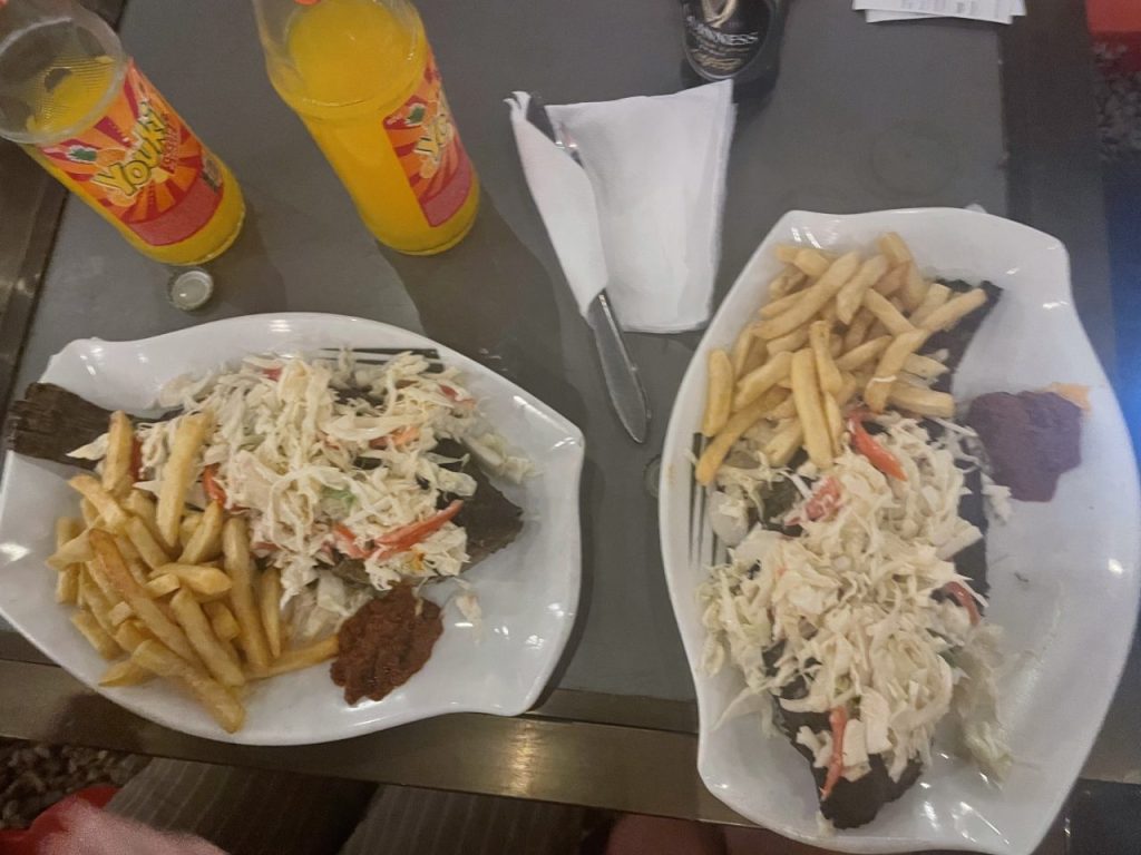 Am 21.11. kommt es nach unserer Arbeit zu einem angenehmen Missverständnis: Der Père lädt uns zum Essen ein. Christine und ich hatten vor einer Woche verabredet, dass es bald an der Zeit war, einen Snack-Tag umzusetzen, an dem wir uns durch das Streetfood testen, dass uns mit jedem weiteren Tag mehr dazu verlockt es zu probieren. In meiner Euphorie hatte ich dem Père von unserem Plan erzählt, sodass er vorschlug, wir sollten diesen Snacktag an einem Freitag nach der Arbeit gemeinsam machen. Nur wurde aus dem Snack ein ganzes Abendessen und wir fanden uns in einem Restaurant mit angenehmer Musik wieder und verspeisten einen leckeren Fisch mit Salat und Pommes. Das war ein wirklich schöner Abend, vor Allem weil wir wissen, dass er selbst nie wirklich Zeit für sich hat, da sowohl die Arbeit mit den Kindern, als auch sein Priesterberuf ihn wirklich von morgens bis abends beansprucht.