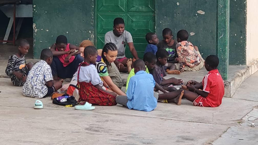 Danach werden wir in einen Hof geführt, indem über 60 Frauen auf dem Boden verteilt sitzen und Essen zubereiten. Es dauert einen kurzen Moment bis wir verstehen, dass das bereits die Gefangenen Frauen sind, welche sich in einer Art Halbkreis um die Tür der Minderjährigen befinden. Als wir durch diese eintreten, formieren sich 17 junge Männer zwischen 15 und 19 Jahren vor uns, um den ermutigenden Worten unseres Paters zuzuhören. Er drückt ihnen sein Mitgefühl aus und ermutigt sie, auf das Leben nach dem Gefängnisaufenthalt hin zu arbeiten. Außerdem erklärt er ihnen unsere Solidarität im Gebet, bevor er ihnen eine Bibel als Geschenk übergibt. Die Jungs hören zu, aber man sieht ihnen teilweise an, dass sie in Gedanken woanders sind.