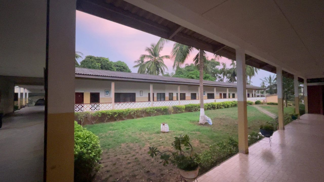 Nach ca. 9 Stunden Fahrt, mit zwei Pausen, kommen wir im Novoziatshaus der Salesianer an, wo wir uns von Frère Christoph verabschieden. Frère Christoph ist der erste Salesianer, der aus Kara kommt. Er hat als jugendlicher Maurer tatsächlich dabei mitgeholfen, unser Haus in Kara zu bauen. Leider hat er inzwischen große gesundheitliche Beschwerden, die ihm das Sprechen erschweren und unter anderem auch Wassereinlagerungen im Fuß, die ihn beim Laufen behindern. Trotz der oftmals hügeligen Strecken, bestand der Bruder darauf, das Noviziatenhaus in Lomé zu verlassen, welches ihm eine bessere gesundheitliche Versorgung garantierte, um nach Kara zurückzukehren. Allerdings ist dieser Versuch gescheitert, sodass er nach einem ein-monatigen Aufenthalt hier mit uns gemeinsam wieder dorthin zurück gebracht wurde.