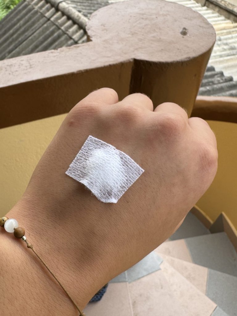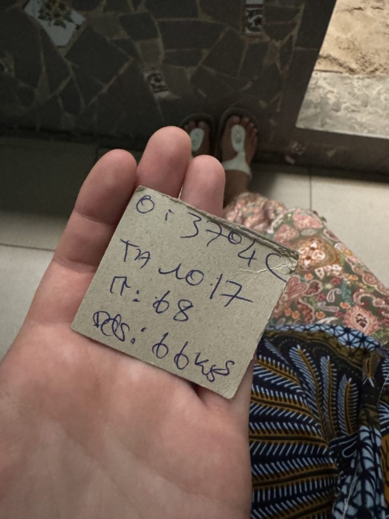 In der Klinik angekommen verlief alles sehr strukturiert: zunächst wurde ich gewogen, anschließend wurden Fieber und Blutdruck gemessen. Alle Werte notierte die Arzthelferin auf einem Stück Karton und drückte es mir in die Hand. Damit sollte ich vor dem Sprechzimmer des Arztes in einem lichtdurchfluteten Innenhof warten. (Dieses Wartezimmer bekommt definitiv 5/5 Sterne!!!)