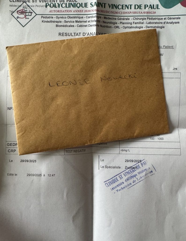 Um 14 Uhr waren dann die Testergebnisse da und in einem beschrifteten Umschlag zur Abholung bereit! Die wichtigste Nachricht: ich habe kein Malaria!
