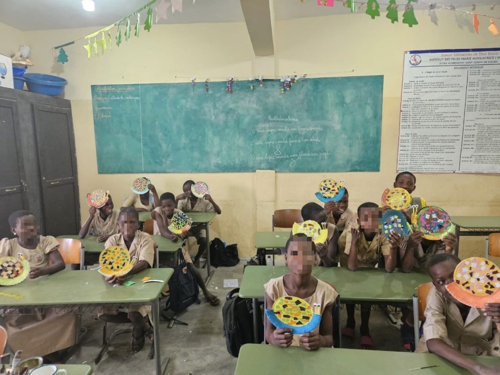 In Deutschland würde man das „Kindergarten“ nennen, wobei das hier schon sehr verschult ist (angelehnt an die französische École maternelle). Als wir dort angekommen sind, haben uns erst einmal 20 Kinderaugenpaare angestarrt, uns im nächsten Moment aber auch schon im Chor begrüßt. Sie waren gerade dabei, aus Krepppapier „petits points“ (kleine Punkte) mit den Fingern zu formen. Wir haben dann der Tata assistiert, indem wir weitere Stücke Krepppapier verteilt haben oder den Kindern geholfen haben. In der Pause wurde draußen fleißig gespielt und ehe ich mich umsehen konnte, waren 6 Kinder auf mir und haben an mir gezerrt oder mich als Trampolin benutzt. Wir haben einen riesigen Spaß gehabt und nur gelacht!