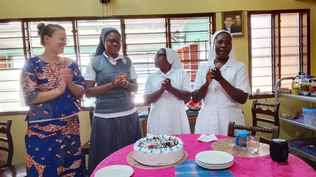 Eingeleitet wurde mein Geburtstag bereits am Sonntag. Im Zuge des wöchentlichen Mittagessens mit den Schwestern in der communauté wurden die Geburtstage der letzten Woche nachgefeiert. Und da erschien es ganz praktisch, meinen Ehrentag gleich mitzufeiern (einen Tag vorher…). Es wurde lecker gegessen und nach einem Bierchen startete dann das eigentliche Partyprogramm. Auf einmal ertönte von draußen Musik und im nächsten Moment betraten einzelne Schwestern zusammen mit den Präaspirantinnen in Form einer Polonaise das Esszimmer – mit einem Prachtexemplar an Torte an der Spitze! Mmmmmhhh sah die lecker aus! Zusammen mit den anderen Geburtstagskindern haben wir die Torte gemeinsam angeschnitten und wurden dabei von allen anderen angefeuert! (Da kam ich mir ja glatt vor wie auf meiner Hochzeit 😉 )