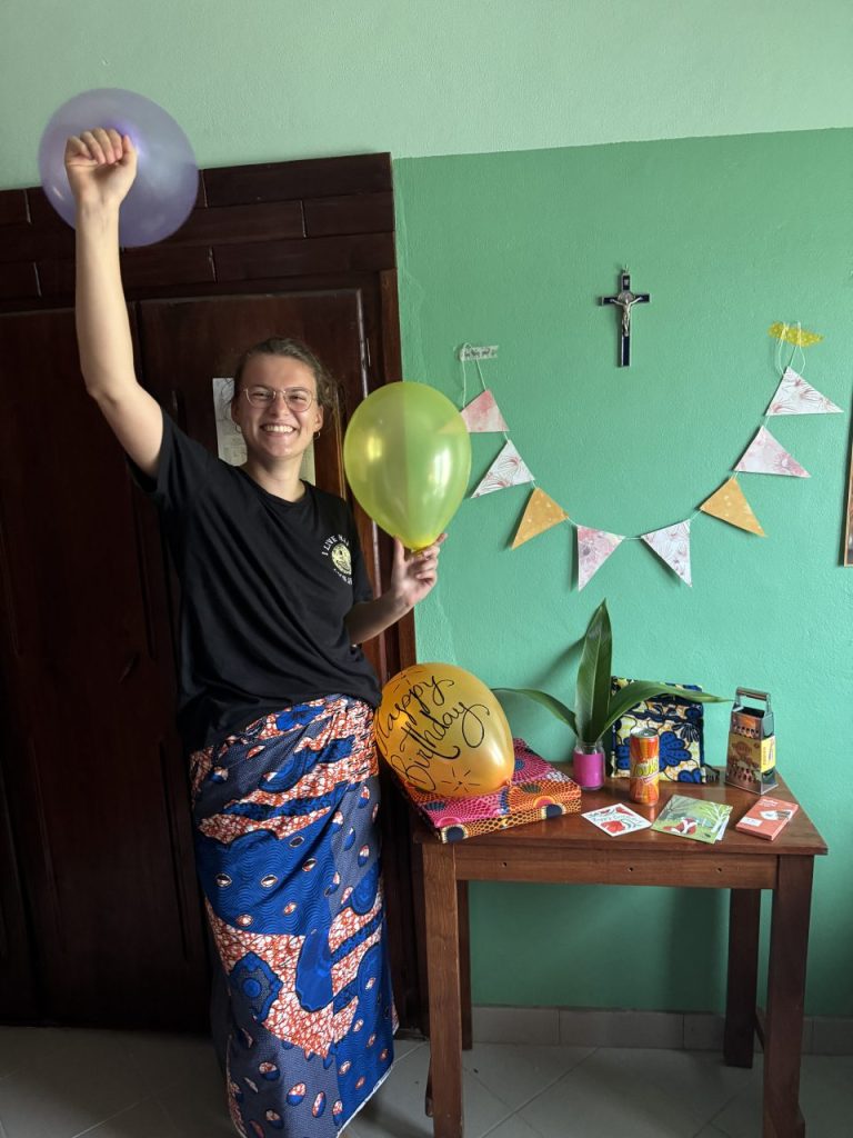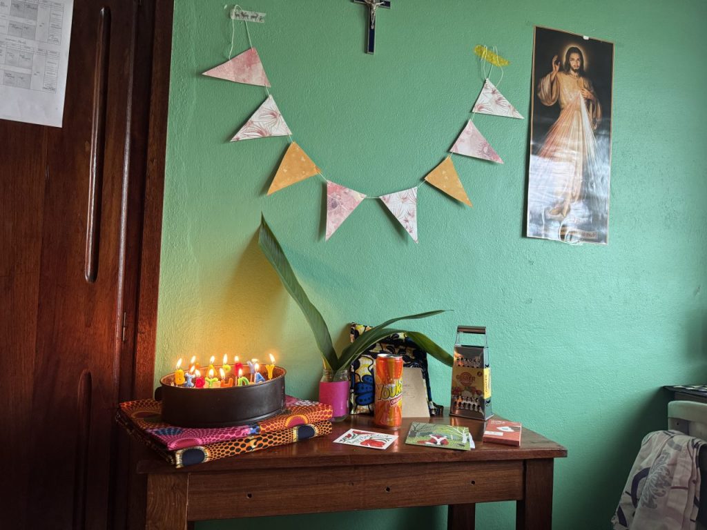 Montagmorgen bin ich früh aufgestanden, um meine tägliche Papaya zusammen mit meinem Müsli auf unserer Wendeltreppe zu löffeln! Heute hat sie natürlich besonders gut geschmeckt ;). Anschließend ging es mit dem Zem zum Maison du soleil – natürlich mit gâteaux im Gepäck! Dort habe ich einen entspannten Vormittag verbracht und mit den Babys gespielt! Zum Mittagessen bin ich nach Hause gefahren, wo mich Maria mit einem schön gestalteten Geburtstagstisch und einem Kuchen überrascht hat! Ich habe mich sooooo sehr darüber gefreut, da es mich auch an zu Hause erinnert hat…Ich durfte die Kerzen auf dem selbst gebackenen Kuchen ausblasen und nach dem Essen ging es auch schon weiter zur Baraque. Nach einem kleinen Ständchen, das mit einer kleinen Abkühlung endete (die Tata hat mich nämlich mit Wasser abgespritzt – fand ich total witzig), haben wir gemeinsam gâteaux gegessen, während wir eine Runde UNO nach der anderen gespielt haben…