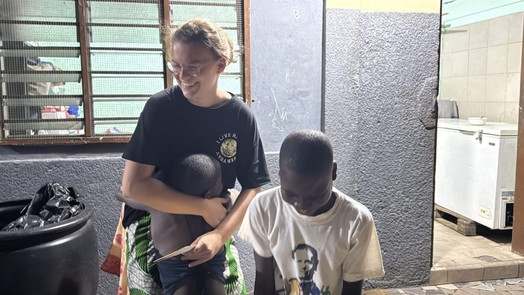 Wer gut aufgepasst hat, weiß, dass jetzt nur noch ein Projekt fehlt. Und zwar das Foyer, denn die Mädchen hab ich natürlich nicht vergessen!!! Zusammen mit 60 Orangen und 55 gebackenen Cookies im Gepäck habe ich mich auf den Weg ins Foyer gemacht. Dort haben die Mädchen ein Lied nach dem anderen für mich gesungen – begleitet mit Trommel und Rassel – und natürlich wurde ganz viel getanzt. Das hat mir so eine Freude gemacht und ich hatte richtig viel Spaß. Anschließend durfte ich auf einem „Thron“ Platz nehmen und dann wurde mir eine selbst gebastelte und geschriebene Karte vorgelesen. Ich war sehr gerührt und im nächsten Moment haben mich die Mädchen umarmt! Dann war ich an der Reihe und hab die Orangen und Cookies mit Maria verteilt.