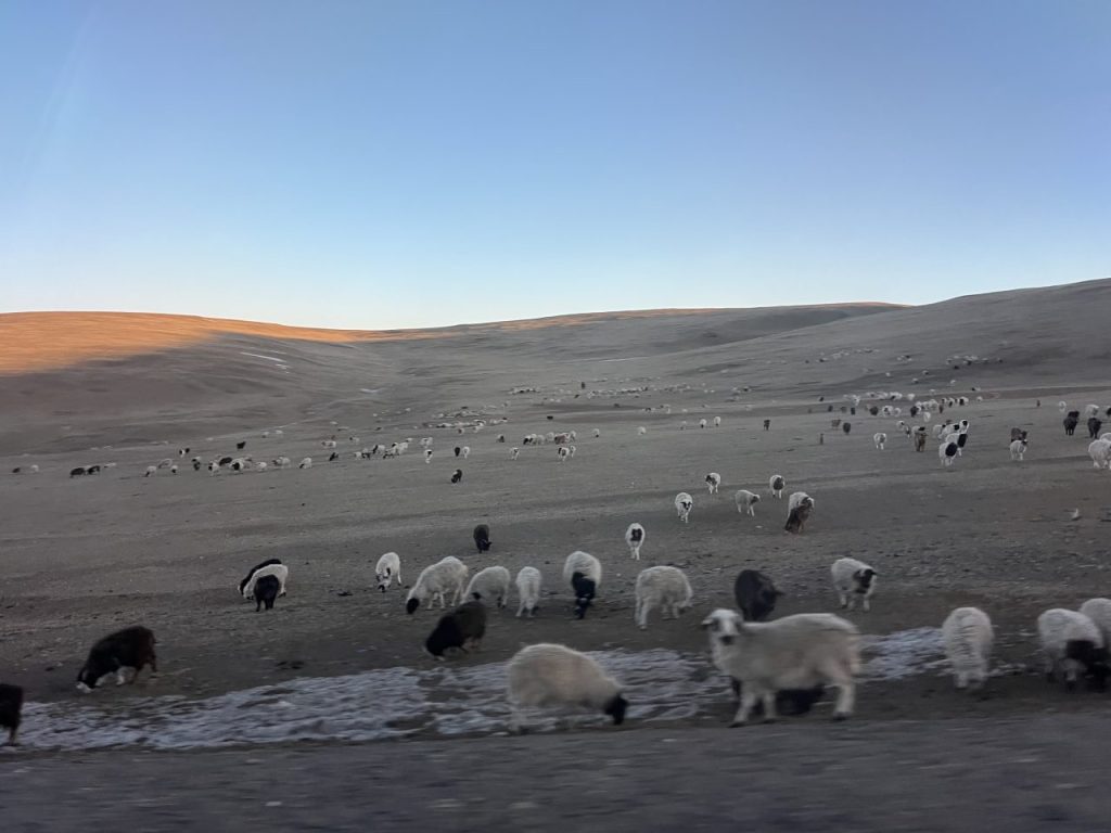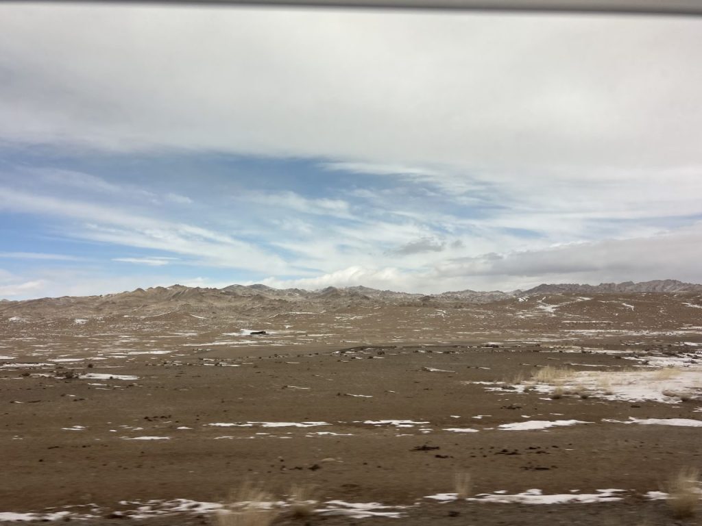 Um Ulaanbaatar herum ist die Landschaft sehr hügelig und fast überall lag noch Schnee auf den braunen Flächen. Mit der Zeit wird die Landschaft bergiger und die Straße windet sich um steinige Hänge. Dann ist wieder alles flach und weit. Ab und zu passieren wir eine Raststätte oder eine kleine Siedlung. Was fast durchgängig die Landschaft füllt sind Herden von wuscheligen Kühen, Pferden oder Schafen. Vereinzelt sind auch Jurten darunter oder man sieht die Herdenbesitzer auf Pferden oder Mopeds ihre Tiere vor sich her treiben.