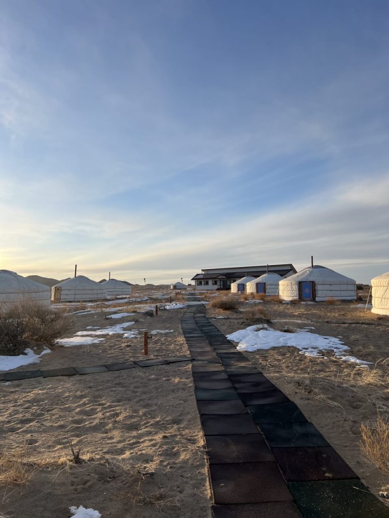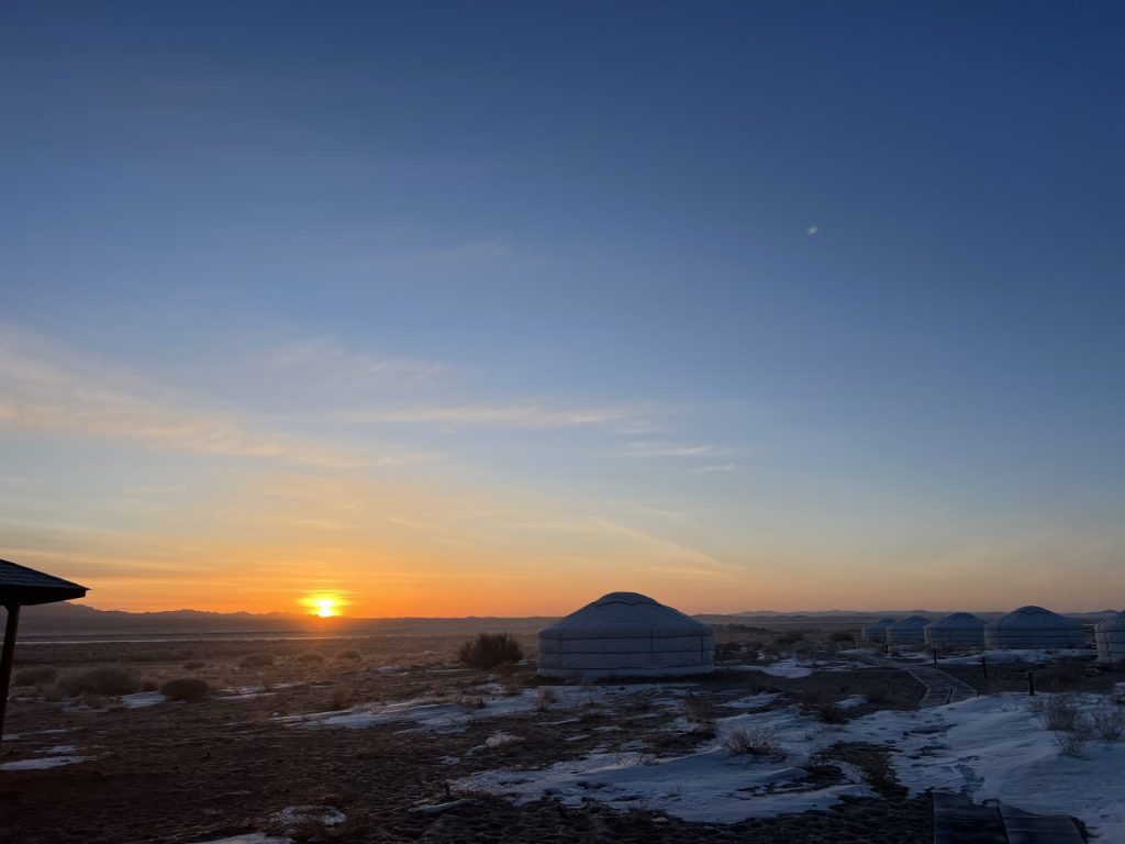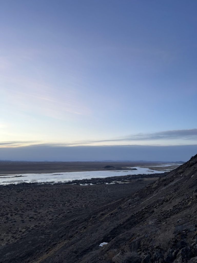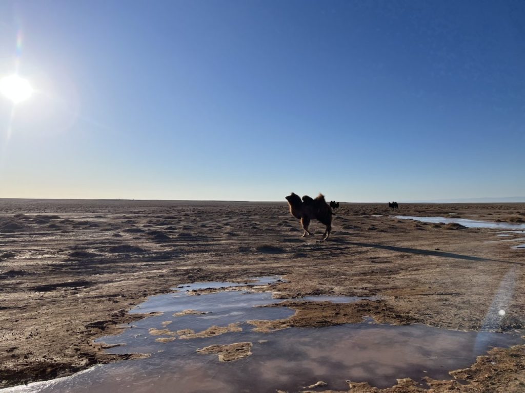 Das Camp liegt auf einer kleinen Anhöhe, von wo man das ganze Tal überblicken kann. In der Mitte fließt der breite Zavkhan River, der noch zugefroren ist. Abgesehen von Herden aus Pferden, Ziegen und Kamelen, die man in der Ferne sieht und einzelnen Vogelschwärmen, wirkt das Tal völlig ohne Leben. Bis auf das leichte Pfeifen des Windes ist es vollkommen still.