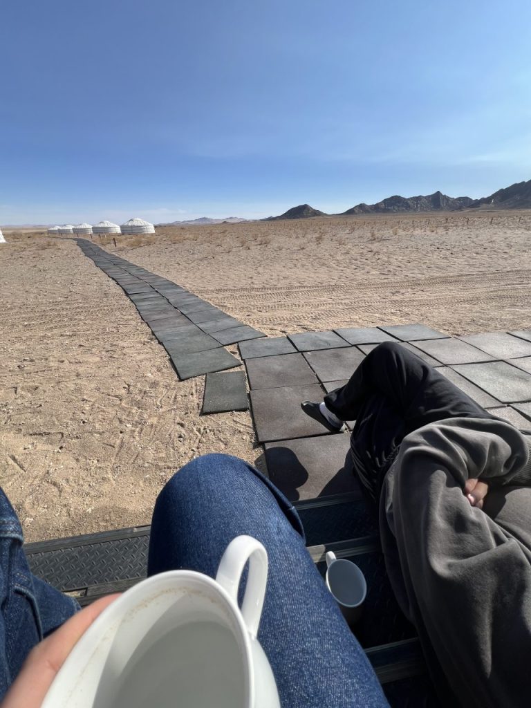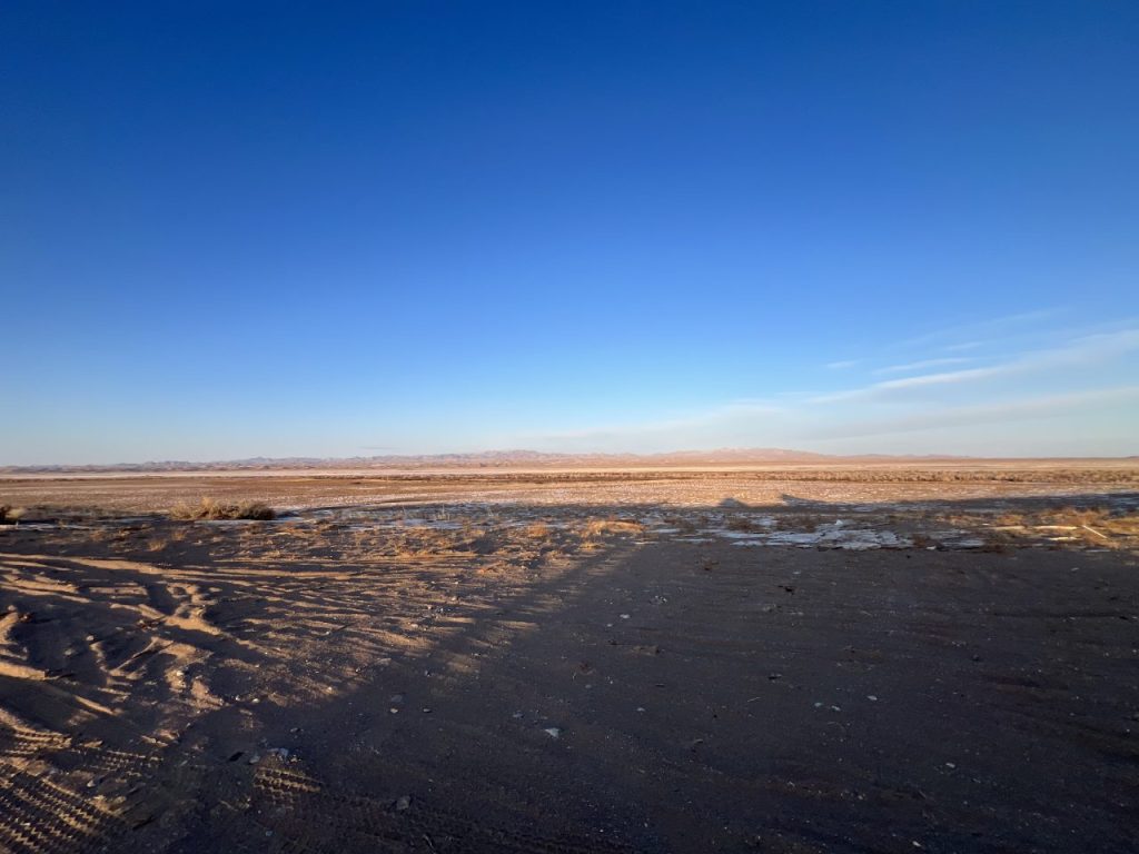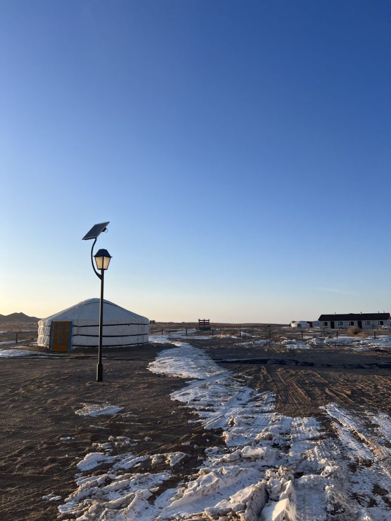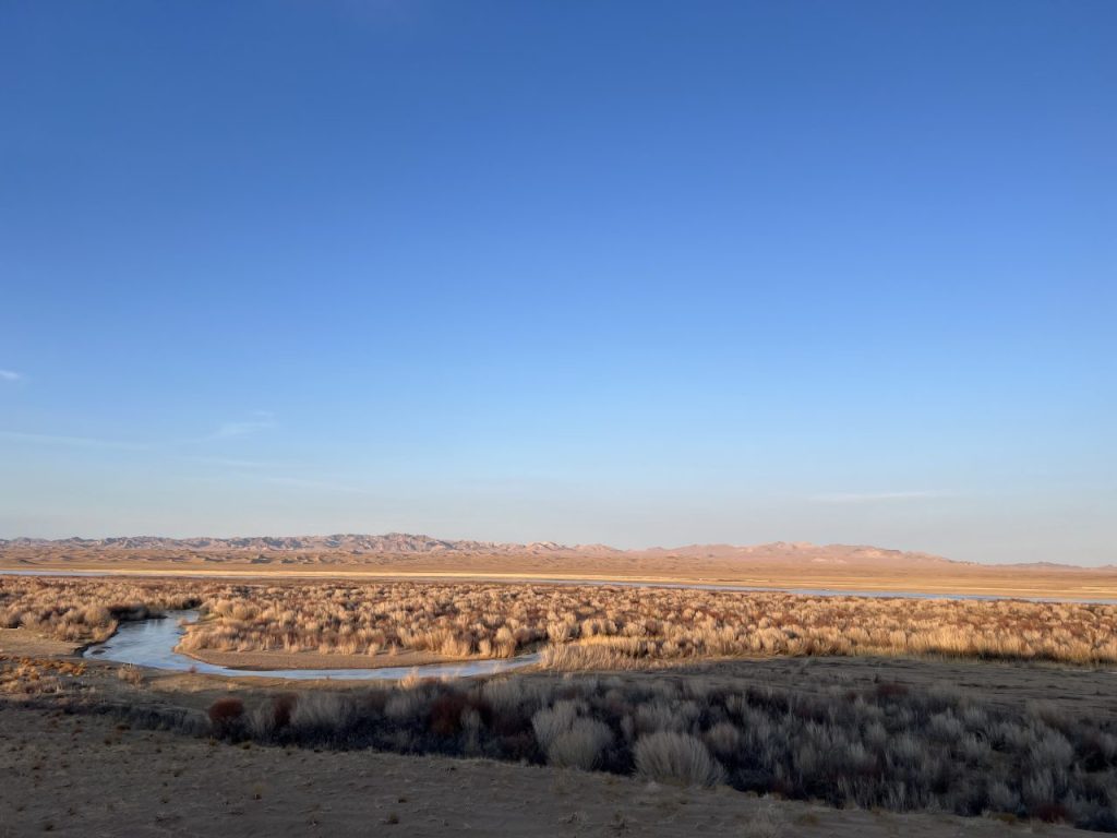 Das Camp liegt auf einer kleinen Anhöhe, von wo man das ganze Tal überblicken kann. In der Mitte fließt der breite Zavkhan River, der noch zugefroren ist. Abgesehen von Herden aus Pferden, Ziegen und Kamelen, die man in der Ferne sieht und einzelnen Vogelschwärmen, wirkt das Tal völlig ohne Leben. Bis auf das leichte Pfeifen des Windes ist es vollkommen still.