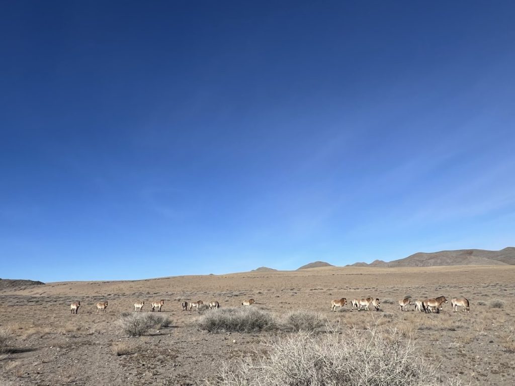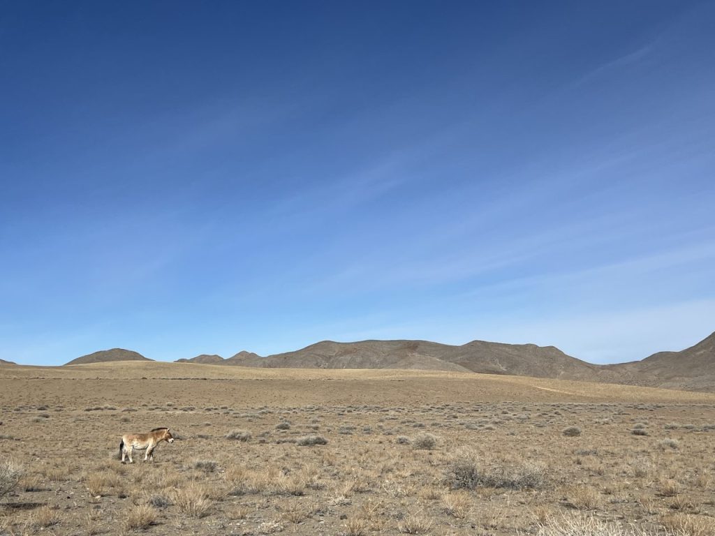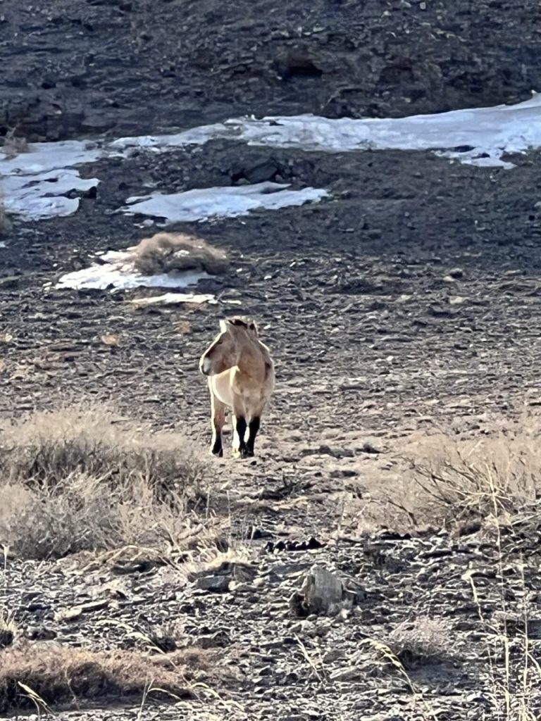 Am einem anderen Tag haben uns die Ranger auf eine Fahrt in die Berge genommen, wo wir schließlich auch die Takhi sehen konnten. 2004 waren die ersten 12 Tiere von Frankreich aus nach Khomyn Tal transportiert worden und inzwischen leben ca. 160 Pferde in dem geschützten Gebiet. Neben den Takhi-Herden, waren auch ein paar Steinböcke und eine Gazelle zu sehen. Ansonsten vorallem Sand, Berge und Himmel.