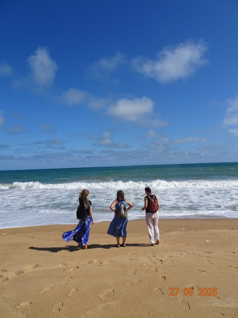 Letztes Wochenende waren wir mit Arnaud in Cotonou, der größten Stadt Benins. Porto Novo ist sehr viel ländlicher als gedacht und die erste Hauptstadt ohne einen einzigen Supermarkt, die ich je gesehen habe. Darum stand für uns als allererstes ein Großeinkauf an, der hauptsächlich aus Regalen, Teppichen und anderen Dingen bestand, die unsere Zimmer nun richtig wohnlich machen. Außerdem haben wir Arnauds Familie kennengelernt und uns mit den zwei Freiwilligen aus Cotonou getroffen. Leonie und Maria haben wir bei unserem dritten Vorbereitungsseminar in Benediktbeuern kennengelernt und wir haben den restlichen Tag am Strand verbracht. Die Wellen hier sind hoch und stark, zu hoch und stark um baden zu gehen, aber beeindruckend anzusehen. „Du musst dir das mal vorstellen: das nächste Land, was hier hinter dem Horizont kommt, ist die Antarktis“. Das ist tatsächlich schwer vorstellbar.