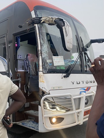 Meine Rückreise war dann leider chaotischer, als es mir lieb war. Unter anderem dadurch, dass ich um 4 Uhr aufwachte und aus dem Fenster den Boden immer näher kommen sah. Ein anderer Bus hatte uns gerammt. Der Fahrer schaffte es im letzten Moment noch das Lenkrad rumzureißen, konnte jedoch nicht verhindern von der Straße abzukommen und einem LKW hinten drauf zu fahren. Also saß ich 2 Stunden, irgendwo auf der togolesischen Autobahn kurz vor Benin und begutachtete den rauchenden, Öl tropfenden Bus mit eingekrachten Scheiben. Alleine, ohne Geld, Essen und SIM-Karte blieb mir nichts anderes übrig, als auf einen anderen Bus zu warten. Ein gutes Training des westafrikanischen Mottos „Irgendwie klappt schon alles-nur Geduld.“