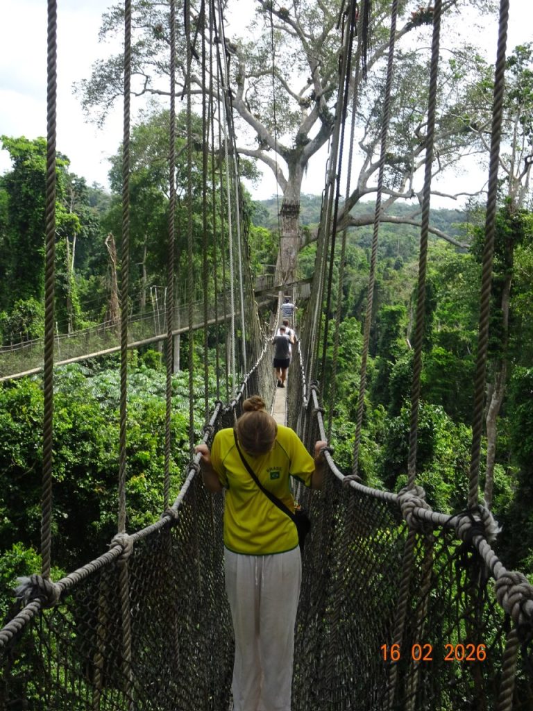 Etwas nördlich der Cape Coast liegt der Kakum-Nationalpark, in den wir am nächsten Tag den sehr touristischen Baumwipfelpfad besuchten und die spektakuläre Aussicht genossen. Auf dem Rückweg hielten wir außerdem an einer Auffangstelle für Krokodile, die wir füttern durften, aßen beim Elmina Castle zu Mittag und verbrachten den Abend im Pool eines Beach Resorts. So touristisch habe ich mich lange nicht mehr gefühlt.